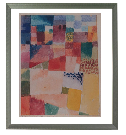 Poster van een kunstwerk door Paul Klee, ingelijst in Florentijns zilver aluminium frame, met passe-partout.