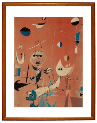 Poster of an artwork by Corneille, framed in cherry wood color frame with mat.