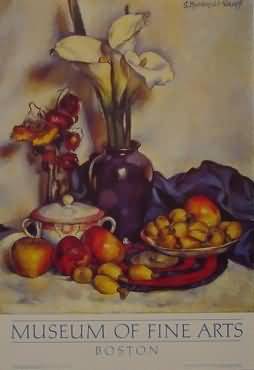 Still life with arum lilies and fruit